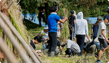 片手に鎌、片手に稲穂――いよいよ稲刈り開始!地元の農家さんと一緒に“お米”の大切さを感じながら、一束ずつ丁寧に。