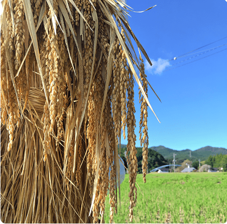 刈り取った稲を束ねて木の棒にかけ、お日さまの力でじっくりと乾かします♪