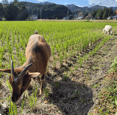 そばでは、ヤギたちが“ひこばえ※”をのんびり食べ放題!収穫のあとも命がめぐり、次の実りへとつながっていくのです。